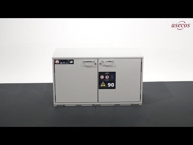 Opbevar og oplad Litium-ion-batterier sikkert i markedets bedste batteriskabe fra Asecos. UNDER BENCH Charge batteriskabet er godkendt til at holde en batteribrand inde i 90 minutter (EN 1363-1) – og beskytte batterierne mod en brand uden for skabet i samme antal minutter (EN 14470-1).